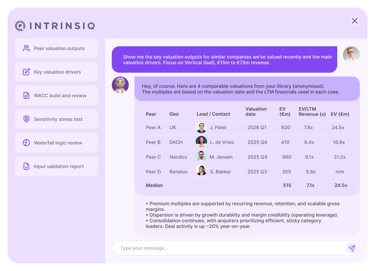 Support for trading multiples, transaction comparables and DCF-based valuation approaches is built directly into the platform. All valuation logic is transparent, consistently applied and fully auditable, reducing review friction and rework.